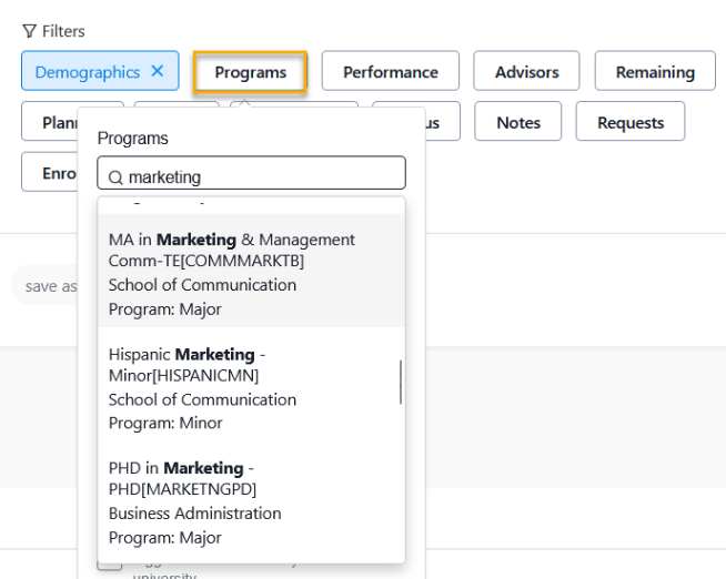 Using the Programs criteria is an additional method for refining and focusing on specific student populations. Stellic offers both undergrad and grad options; for example, choosing "Marketing" may display results for graduate programs in different colleges as well as undergraduate majors and minors. Be cautious when making your selections.